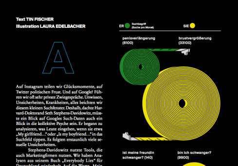 Meine Daten-Seite in der NEON beschäftigt sich diesen Monat mit der Frage, was Google-Suchen über unsere sexuellen Unsicherheiten offenbaren. Wie immer wunderprächtig illustriert von Laura Edelbacher. Ab heute am Kiosk!