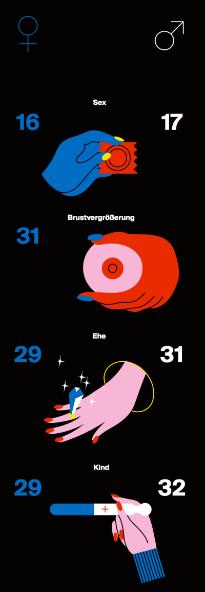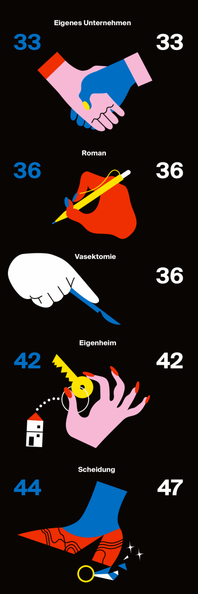 Quellen: LifE-Studie, BZgA und eigene Berechnung (Sex), Statistisches Bundesamt und eigene Berechnung, Deutsche Gesellschaft für Ästhetisch-Plastische Chirurgie, KfW Research (Unternehmen), Jim C. Hines (Roman), vasektomie.de, Bundesamt für Bauwesen und Raumordnung (Eigenheim), Robert Koch-Institut und eigene Berechnung (Burn-out), Bundestag und eigene Berechnung, GfK (Kreuzfahrt), nobelprize.org, Paula Stephan/Sharon Levin (Nobelpreis-Durchbruch)