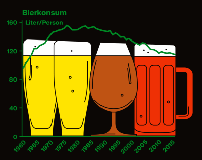 (Fehler auf der Grafik, im Heft ist er korrigiert: Es handelt sich nicht um den Konsum – der liegt heute etwas unter 100 Liter – sondern um die Produktion)