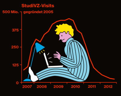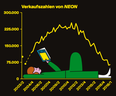 An einem dieser Kurvendiagramme litten wir in den vergangenen Jahren ständig, da gibt es nichts zu beschönigen: den Verkaufszahlen von NEON. Ein Trost war es dann manchmal schon, auf Kurven wie die von StudiVZ oder Blackberry zu schielen. Oder andere schleichen de Trends zu beobachten, schwindende SPD Mitgliedschaften etwa. Sogar der Bierkonsum lässt nach, in Deutschland!