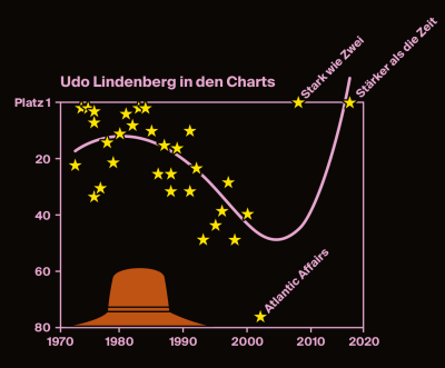 Ja selbst wenn eine Kurve bei null an gelangt ist, so gut wie tot, schwingt sie sich manchmal wieder in ungeahnte Höhen auf. Damals, als NEON gegründet wurde, erreichten die Plattenverkäufe ein historisches Tief, und Udo Lindenberg brachte ein Album heraus, das seinen stetigen Abstieg in den Charts nochmals dramatisch beschleunigte. Und heute? Sind Platten so gefragt wie Ende der 80erJahre, und Udo Lindenberg landete – zum ersten Mal in seiner Karriere – mit seinen Alben auf der Eins. Stärker als die Zeit.