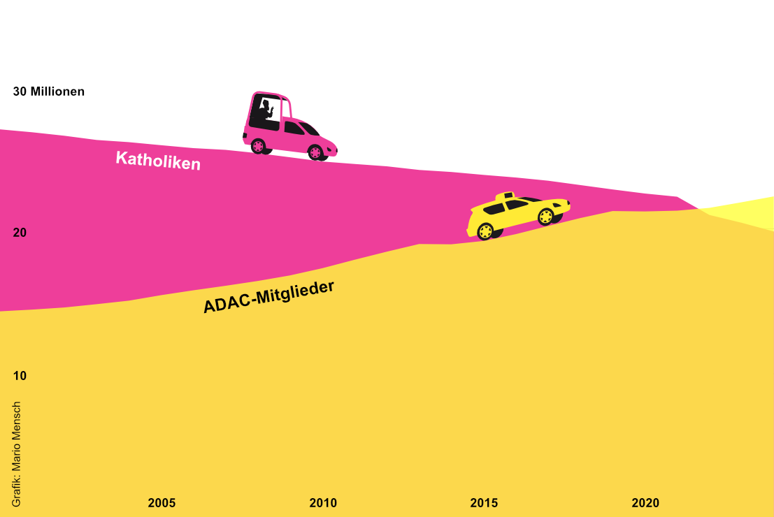 Treffen sich zwei Zahlen, entsteht meistens eine Geschichte. Zum Beispiel diese: 2024 überholte der ADAC die Katholische Kirche. Je mehr Mitglieder die Kirche verlor, desto mehr gewann der ADAC. Kann das ein Zufall sein? Das sind die Geschichten, die aus Zahlen entstehen.